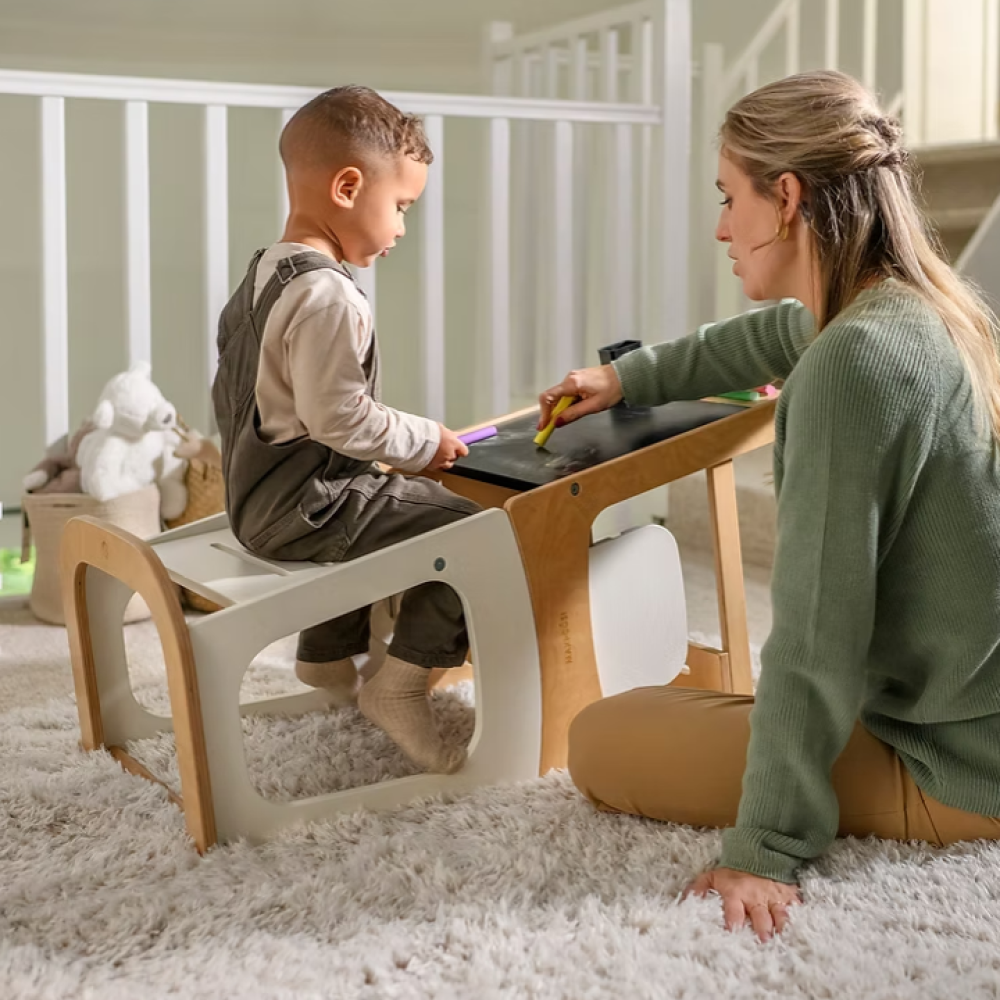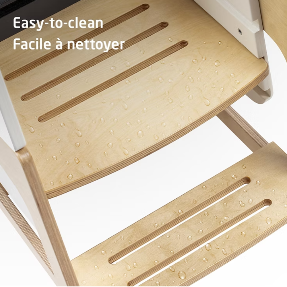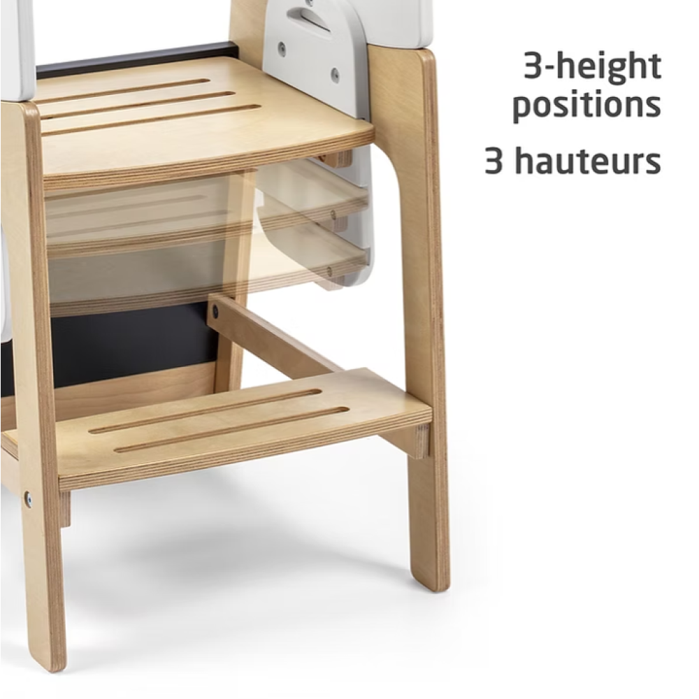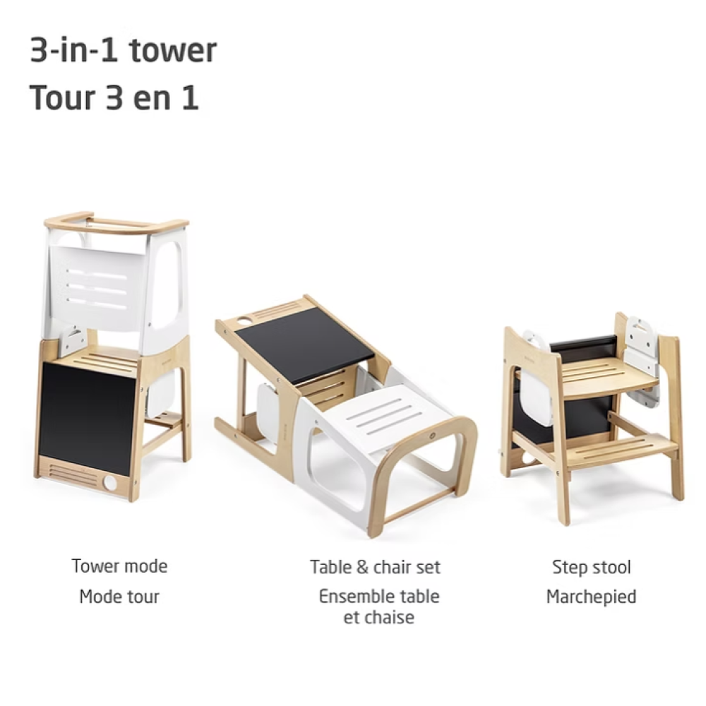 La Tour Toucan se transforme facilement en tour d’apprentissage, en ensemble table et chaise, puis en marchepied robuste, utilisable par toute la famille.